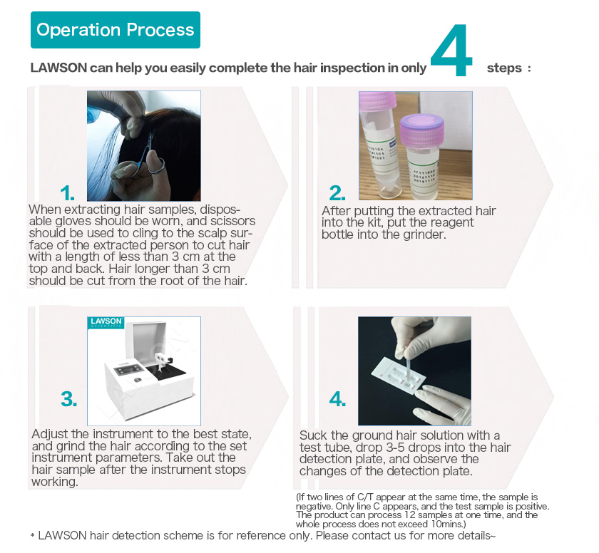 LAWSON DH-2020 hair Tissuelyser Using a special "8"-shaped three-dimensional oscillation mode, through the high-frequency reciprocating vibration, impact and shearing of grinding beads (zirconia, steel balls, glass beads, ceramic beads), it is not only suitable for hard, medium-hard and brittle samples It is also suitable for soft, elastic, fibrous materials, etc. The ideal grinding effect can be achieved quickly, so that the ground samples have more sufficient, more uniform, better sample repeatability, and no cross-contamination between samples. After grinding, the colloidal gold detection technology can be used for rapid on-site detection of common drugs (morphine, methamphetamine, ketamine, ecstasy, marijuana, etc.) in hair. The detection limits of various drugs have reached the requirements of the "Specifications for the Detection of Hair Samples of Drug-related Persons" issued by the Ministry of Public Security. The product has been widely recognized in the industry since its introduction. The advantages of high sensitivity and high sensitivity are currently very suitable for the hair drug detection equipment used by public security anti-drug law enforcement officers on the spot.
