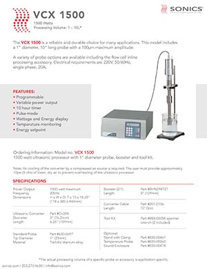 SONICS Industrial Ultra Sonicator VCX 1500 is a reliable and durable choice for many applications. This model includes a 1" diameter, 10" long probe with a 100μm maximum amplitude and a booster.