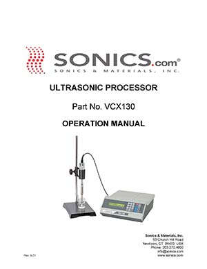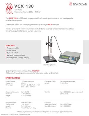 SONICS Probe Sonicator VCX130: Ultrasonic Liquid Processor for Small Batch Applications, 130 Watt Ultrasonic Processor with Timer and Pulser to safely process a wide range of organic and inorganic materials, from 150 microliters to 150 milliliters. Typical applications include biotechnology and pharmaceutical processing, including mixing, dispersion and sample preparation for use.